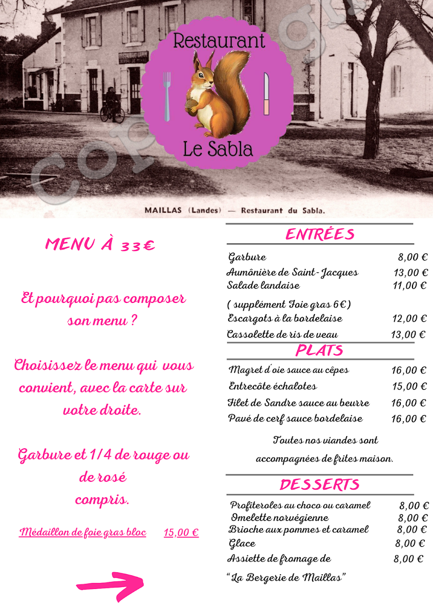 You’ll find hearty options like Garbure, a traditional Landaise soup perfect for cooler days, alongside refined dishes such as Filet de Sandre with beurre sauce. Meats like Entrecôte Échalotes and Confit de Canard come served with house-made frites, fitting well with the restaurant’s welcoming and relaxed vibe. For dessert, choices like Omelette Norvégienne and Crème Le Sabla offer a gentle, familiar sweetness to end your meal on a pleasant note.